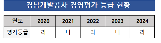 경남개발공사는 2024년 기준 기업경영평가에서 ‘라’ 등급을 받았다. 이는 전체 대상 중 약 6~7% 수준의 하위 그룹에 해당한다. 해당 등급을 받을 경우 평가급 축소, 경영진단 실시, 조직·사업 구조조정 권고 등 경영개선 조치 대상이 될 수 있다.