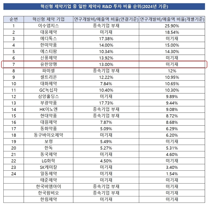 유한양행의 2024년 기준 매출 대비 R&D 비율은 13%다. 혁신형 제약기업 중 28개 일반 제약사(사업보고서에 미기재한 4개사 제외) 중에서는 7위에 해당한다. 상위 30%(8위 이내)에는 속하지만 약가제도 개편에 따른 영향권 경계선에 근접한 순위이다.