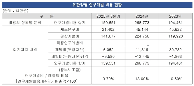 그럼에도 올해 3분기 R&D 투자 비율은 9.7%로 2024년 대비 3.3%p 낮아졌다. 현 비율대로면 혁신형 제약기업 중 상위 30%에서 밀려날 가능성이 크다. 그러나 유한양행은 측은 4분지까지 포함하면 매출 대비 R&D 투자 비율이 10% 이상을 기록할 것으로 전망했다.