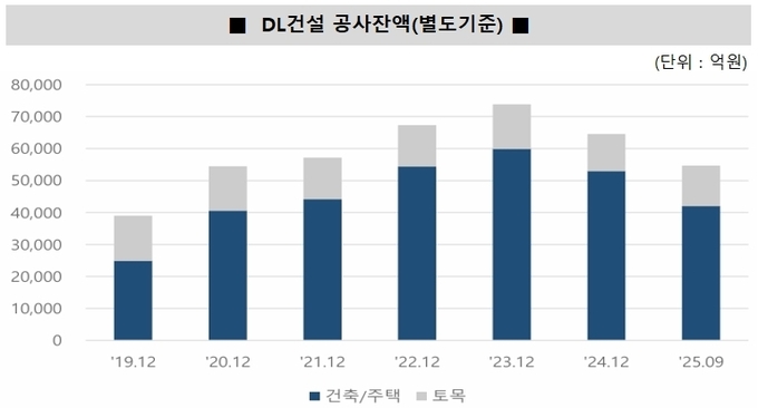 이에 힘입어 DL건설의 매출액은 2019년 1조3000억원에서 2024년 2조5000억원으로 크게 늘었다. 다만 국내 건설경기 둔화로 착공 전환 물량과 신규 수주가 줄어들면서 2025년 이후 매출 규모는 2023~2024년 대비 다소 낮아질 것으로 전망된다.