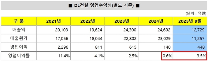 DL건설의 영업 수익성은 분양경기 호조가 이어졌던 2020~2021년 영업이익률 10% 이상을 기록하며 정점을 찍었다. 이후 건설경기 둔화와 공사원가 상승 부담으로 수익성은 점차 하락했다. 특히 호텔 개발사업과 물류센터 등 일부 비주거 사업장에서 공사지연과 추가 비용이 발생하며 원가율이 크게 악화됐다.
