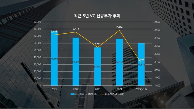 한국벤처캐피탈협회(KVCA)에 따르면 올해 11월까지 VC업계 신규투자 금액은 5조9894억원으로 집계됐다. 전년 동기(5조6634억원)보다 5.8% 늘었다. 반면 같은 기간 투자받은 기업 수는 2244개에서 2086개로 7.0% 감소했다.