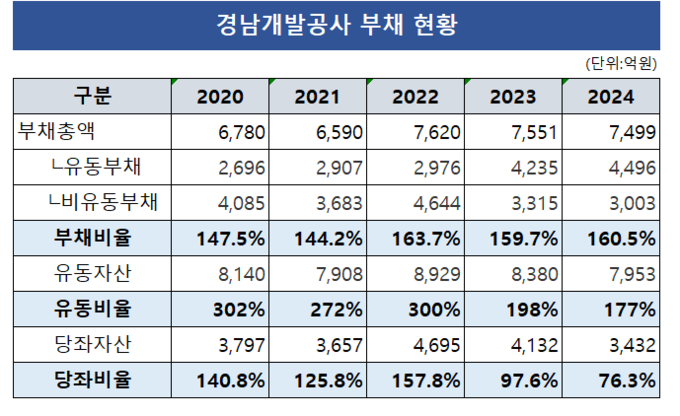 경남개발공사는 2022년을 기점으로 부채 규모가 빠르게 늘었다. 2020~2021년에는 부채가 최대 6780억원 수준에서 유지됐으나, 2022년 약 7620억원으로 급증했다. 이후 일부 감소했지만 현재도 7400억원대를 웃도는 높은 수준을 이어가고 있다.