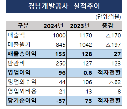이러한 와중에 실적마저 적자전환하며 경남개발공사의 상황은 더 악화됐다. 경남개발공사는 2024년 매출 감소와 비용 부담 확대가 겹치며 손익 구조가 적자로 전환됐다. 2024년 매출액은 1000억원으로 전년 1170억원 대비 약 170억원 감소했다. 이는 2023년 288억원에 달했던 주택매출수익이 2024년에는 발생하지 않으면서 매출 기반이 축소된 영향이 컸다. 반면 용지매출수익은 950억원으로 전년 832억원 대비 증가했으나 주택부문 공백을 상쇄하기에는 한계가 있었다.