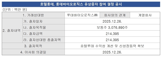 정정공시에 따르면 주주배정 유상증자 청약 결과 발생한 실권주로 신주의 수와 자금조달액이 변경됐고 실권주 318만324주는 롯데바이오로직스 이사회 결의를 통해 307만6890주는 호텔롯데에 배정하고 10만3434주는 미발행 처리하기로 했다. 호텔롯데가 출자하는 자금 규모는 2144억원이다.