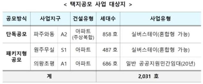 택지 공모는 약 2000가구 규모로 추진된다. 사업 대상지는 파주 와동 A2블록, 원주 무실 S1블록, 의왕 초평 A1블록 총 3곳이다. 파주와동 A2블록과 원주무실 S1블록은 실버스테이로, 의왕초평 A1블록은 임대의무기간이 20년인 일반공공지원민간임대로 공급한다.