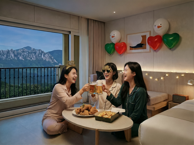 패키지 구성은 객실 1박, 야식, 파티 용품 등이다. 파티 용품 세트는 스탠드 풍선, 머리띠, 선글라스, 미니 빔으로 구성됐다. 체크인 후 프런트에서 수령하면 된다. 야식 메뉴는 리조트마다 조금씩 다르다. 한화리조트 설악 쏘라노는 치킨과 감자튀김, 생맥주를 제공한다. 한화리조트 용인 베잔송은 떡볶이와 치킨텐더, 생맥주 조합을 준비했다.