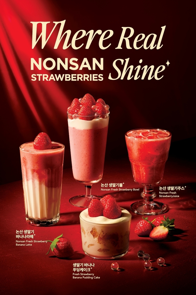 논산 생딸기 주스는 제철 생딸기를 그대로 갈아 넣은 신선함이 특징이며 논산 생딸기바나나라떼는 딸기의 산뜻함과 바나나의 부드럽고 달콤함이 더해져 모두의 입맛을 사로잡는다. 논산 생딸기볼은 기존의 라떼를 마시고 떠먹을 수 있는 ‘디저트형 음료’로 변화시켜 음료의 새로운 경험을 제공한다. 부드러운 딸기 스노우 위 생딸기와 톡톡 터지는 ‘팝핑보바’ 토핑이 더해져 음료와 디저트를 넘나드는 다채로운 식감을 선사한다. 생딸기 바나나푸딩케이크는 부드러운 바나나푸딩에 상큼달콤한 딸기가 조화롭게 더해진 케이크이다. 일반 케이크보다 진한 과육 본연의 맛을 느낄 수 있어 바나나와 딸기의 풍부한 맛을 눈과 입으로 즐길 수 있다.