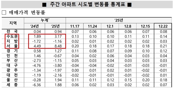 세 차례 대책을 거치며 거래량은 눈에 띄게 줄었지만 서울 집값은 연중 상승 흐름을 멈추지 않았다. 12월 기준 서울 아파트값은 45주 연속 상승하며 누적 상승률 8%를 넘겼고 이는 과거 상승기와 견줘도 높은 수준이다. 반면 지방은 미분양과 가격 하락이 이어지며 침체가 심화됐다.