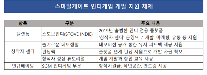 스마일게이트의 인디게임 지원은 2010년대 초 게임·디지털 창작자를 대상으로 한 인재 육성 프로그램에서 출발해 유통 플랫폼 구축과 공모전·공간 지원·지자체 협업으로 확장됐다. 2010년 스마일게이트멤버십(SGM)을 시작으로 인디게임을 포함한 창작자 인큐베이팅 체계를 구축했고 이후 멘토링·창작지원금·개발 공간 제공 등을 통해 인디 개발팀에 대한 장기 지원 기반을 다졌다.