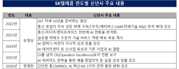 이 가운데 통신 분야가 신년사 핵심 키워드로 다시 등장한 점이 눈에 띈다. 유영상 전 대표 재임 시절 SK텔레콤 신년사의 중심 키워드는 일관되게 ‘AI 혁신’이었다.