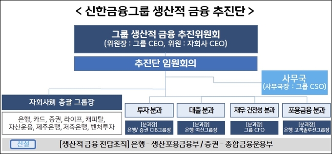 이 중 생산적 금융은 정부, 전 금융권이 최근 ‘본격화’를 강조하고 있는 만큼 주요 경영 추진 전략으로 평가된다. 신한금융 역시 지난해 말 그룹 차원의 조직개편을 통해 생산적 금융의 실행력을 높였다. 조직개편에는 생산적 금융 관련 영역별 분과, 자회사별 전담 조직 신설 등의 내용이 담겼다.