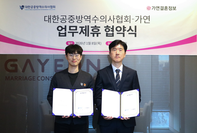 [FETV=장명희 기자] 결혼정보회사 가연(대표 김영주)과 대한공중방역수의사협회(이하 대공수협, 회장 이진환)가 성혼 컨설팅 제공을 위한 업무협약(MOU)을 체결했다. 대공수협은 국가 가축방역업무에 종사하며 병역 의무를 이행하는 공중방역수의사들의 대표 단체다.