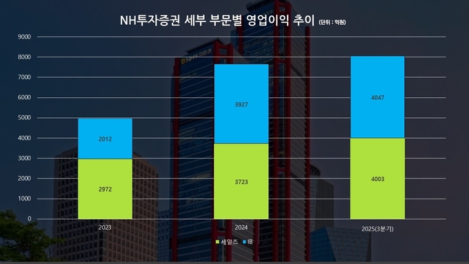 실적 개선의 중심에는 IB(투자은행) 부문이 있다. NH투자증권의 IB 부문 영업이익은 2025년 3분기 누적 기준 4047억원을 기록했다. 2023년(2012억원)과 비교하면 사실상 두 배 수준이며, 2024년(3927억원) 대비로도 증가 흐름을 이어갔다. 4분기까지 더해지면 성장세는 더 가파를 것으로 보인다.