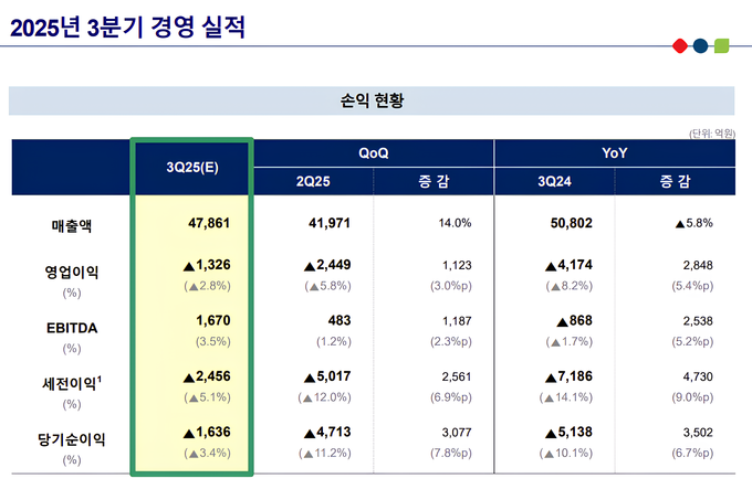 롯데케미칼은 지난해 3분기 누적 기준 매출 13조7731억원, 영업손실 5096억원을 기록했다. 매출은 전년 동기 누적 15조1028억원 대비 8.8% 감소했다. 영업손실은 전년 동기 누적 6809억원 대비 축소됐지만 여전히 대규모 적자가 이어지고 있다. 업황 회복이 지연되는 상황에서 구조적 업황 개선 없이는 실적 반등을 기대하기 어렵다는 평가가 이어진다.