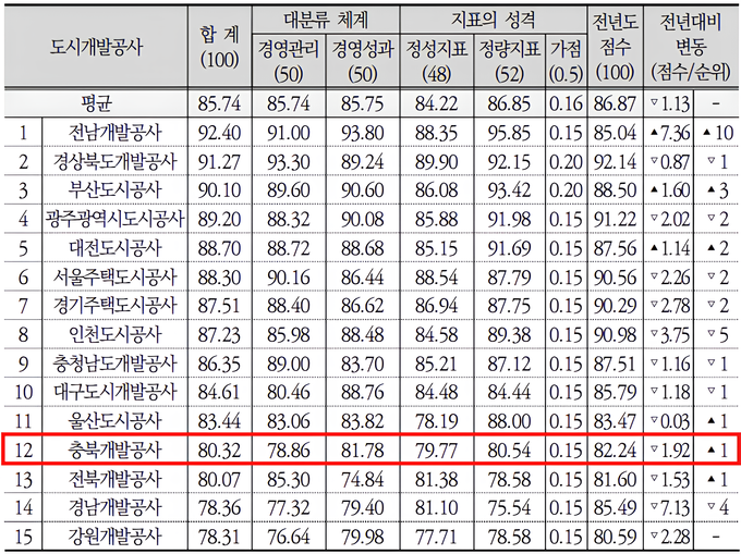 충북개발공사는 지난해 지방공기업 경영성과평가에서 80.32점을 기록해 전체 개발공사 15곳 가운데 12위에 머물렀다. 경영관리·성과, 정성·정량 지표 모두 평균을 하회한 수치를 기록했다.
