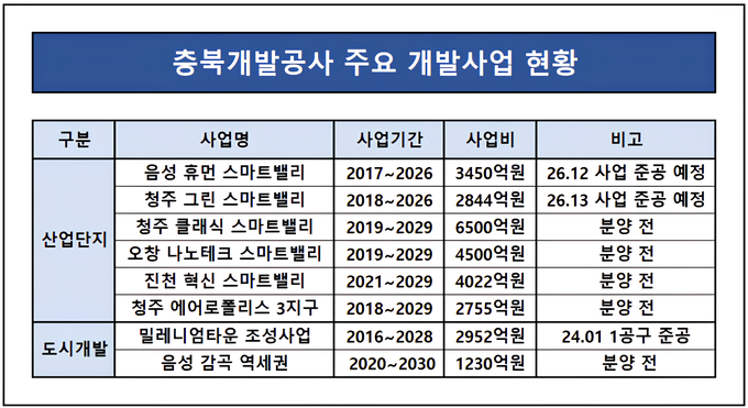 또 충북개발공사 관계자는 사업 구조에 대해 “현재 사업 구조는 산업단지 위주로 짜여 있어 신재생에너지나 친환경 분야 등 사업 다각화는 검토 단계에 머물러 있다”며 “기존 산업단지 개발이 일정 부분 마무리된 이후에는 확장 여지도 열어두고 있다”고 전했다.