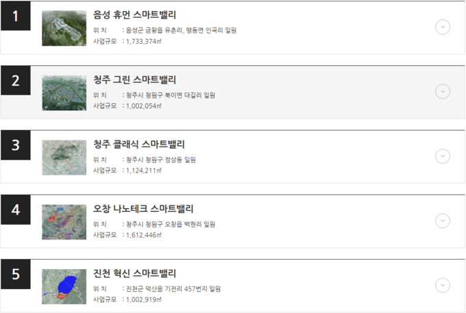 이들 산업단지는 청주공항 주변의 청주 에어로폴리스 3지구를 제외하면 모두 ‘스마트밸리’라는 이름 아래 묶였다. ▲청주 그린 스마트밸리 ▲오창 나노테크 스마트밸리 ▲진천 혁신 스마트밸리 등이 대표적이다.