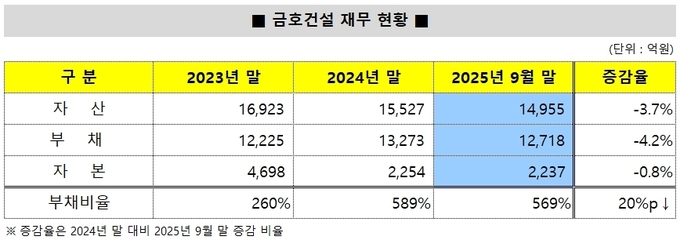 안전 리스크와 함께 재무 부담도 동시에 부각되고 있다. 금융감독원 전자공시시스템에 따르면 금호건설의 지난해 3분기 기준 부채비율은 569%에 달한다. 2023년 말 260% 수준이었던 부채비율이 불과 2년여 만에 두 배 이상 치솟은 셈이다. 시공능력평가 24위 건설사라는 위상과 비교하면 25위 두산건설(345%), 26위 한신공영(179%), 28위 동부건설(204%) 등 주요 경쟁사보다도 재무 부담이 크게 높은 수준이다.