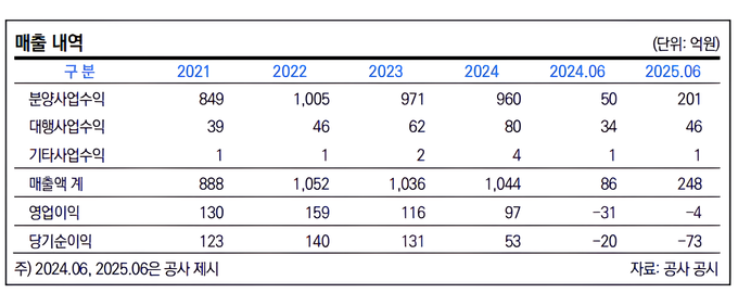 지난해 상반기의 경우 전체적인 경기 침체와 주요 산업단지 현장의 분양실적이 둔화된 점이 실적에 영향을 미쳤을 것으로 보인다. 지난해 상반기 매출은 약 249억원으로 이는 대규모 분양 부재가 실적에 그대로 반영된 영향으로 해석된다. 여기에 청주공항 인접 도시개발 사업인 밀레니엄타운 복합용지와 관련해서 계약해지비용충당비용 약 90억원이 인식돼 당기순손실을 기록했다.