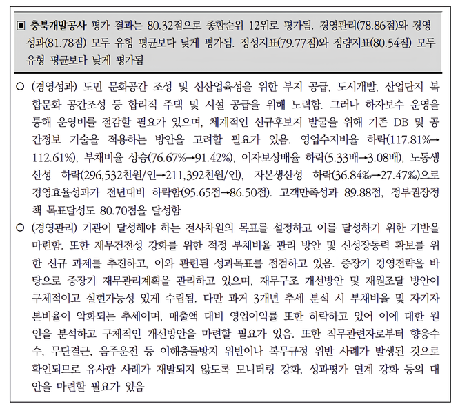 경영성과평가에서도 이러한 부채비율과 더불어 자기자본비율 악화 추세가 언급됐다. 또 하자보수 운영 등을 통해 운영비 절감의 필요성과 구체적인 재무 구조 개선방안 마련 필요성도 함께 제기됐다.