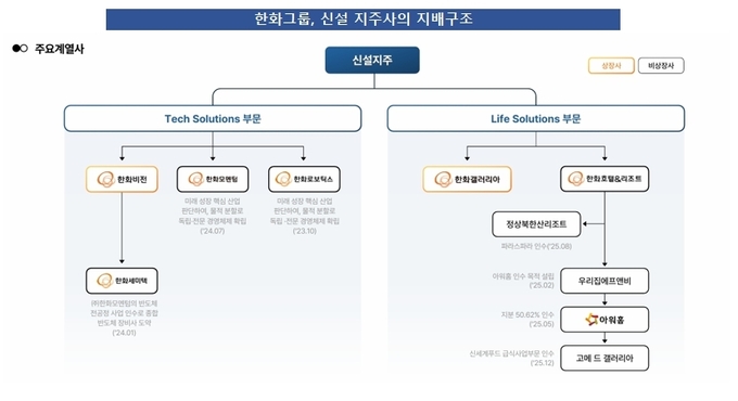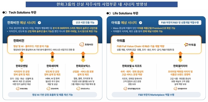 이러한 인적분할이 이뤄진 후 신설 지주사가 추진해나갈 사업전략은 기업가치 제고 계획에 담아 공시했다. 신설 지주사의 사업부문은 크게 테크솔루션부문(한화비전, 한화모멘텀, 한화로보틱스)과 라이프솔루션부문(한화갤러리아, 한화호텔앤드리조트)로 이뤄진다.