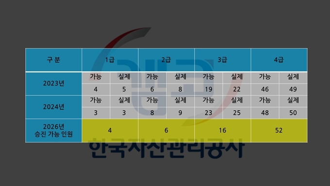 문제는 승진 가능 인원 산정 과정이 규정과 달랐다는 점이다. 현행 규정상 승진 가능 인원은 정원과 현재원의 차이에 상위 직급 결원을 더하는 방식으로 산정한다. 그러나 감사원에 따르면 캠코는 2023년 1급 1명·2급 2명·3급 3명·4급 3명을, 2024년에는 2급 1명·3급 2명·4급 2명을 각각 임의로 가산해 승진 가능 인원을 늘린 것으로 나타났다.