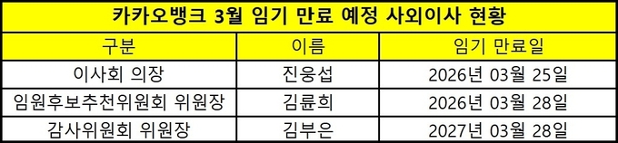 카카오뱅크의 사외이사 6명 중 오는 3월 정기주주총회 시점에 임기가 만료되는 인원은 김부은 사외이사, 김륜희 사외이사, 진웅섭 사외이사다. 통상 금융권 사외이사들이 최대 임기 내에서 대부분 연임하는 모습을 보여왔지만, 최근 금융당국이 사외이사의 독립성과 다양성을 강조하고 있는 만큼 변화 가능성이 없는 상황은 아니다.