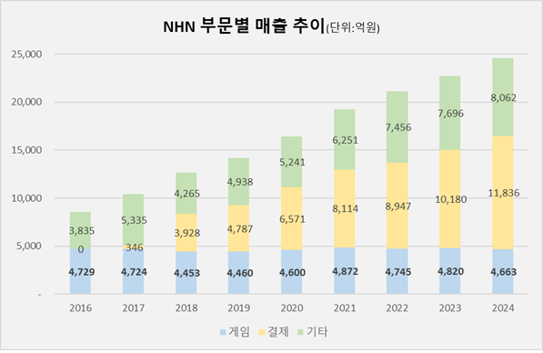 NHN은 2010년대 중반까지만 해도 게임 부문이 매출 구조의 중심을 이뤘다. 한게임을 기반으로 한 게임 사업은 2013년 당시 전체 매출의 절반 이상을 차지하며 회사의 정체성을 상징하는 핵심 축으로 기능했다. 2016년 기준 게임 부문 매출은 4729억원으로 전체 매출의 55.2%에 달했다.