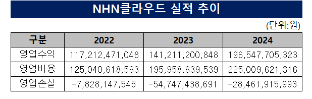 기술 부문에서도 고민 지점은 있다. NHN클라우드는 매출 확대에도 불구하고 비용 부담이 커지며 적자를 이어갔다. 영업수익은 2022년 1172억원에서 2023년 1412억원, 2024년 1965억원으로 증가했지만 영업비용은 같은 기간 1250억원에서 1959억원, 2250억원으로 더 빠르게 늘었다. 이에 따라 영업손실은 2022년 78억원에서 2023년 547억원으로 확대됐다가 2024년 285억원으로 줄었지만 적자 구조는 지속되고 있다.