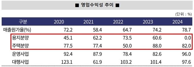 그러나 분양 중심 구조의 특성상 수익 가변성은 여전히 높은 수준이다. 주택 분양 사업의 채산성 자체는 양호한 편이지만 매출 규모 변화에 따라 수익성이 크게 흔들릴 수밖에 없는 구조가 유지되고 있다. 여기에 최근 건설비와 제반 비용 상승, 부동산 경기 둔화가 겹치며 분양 원가 부담도 과거보다 높아진 상황이다.