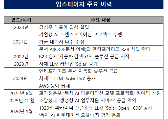 이어 지난 6일에는 1020억개 파라미터를 가진 오픈소스 LLM ‘Solar Open 100B’를 공개해 허깅페이스와 기술 리포트를 통해 배포했고 지난 15일에는 LG AI연구원, SK텔레콤과 더불어 '독자 AI 파운데이션 모델' 1차 평가를 통과한 3팀 중 1팀으로 남았다.
