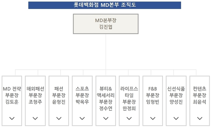 그러다 이번에 백화점과 아울렛·몰의 MD팀을 통합시켰다. 이로써 MD본부 산하에 9개의 부문을 두는 형태가 됐다. 구체적으로 MD전략부문, 해외패션부문, 패션부문, 스포츠부문, 뷰티·액세서리부문, 라이프스타일부문, F&B부문, 신선식품부문, 콘텐츠부문이다.