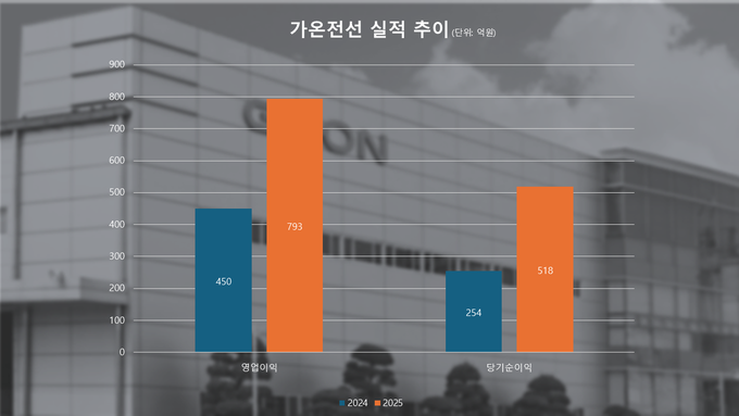 금융감독원 전자공시시스템에 따르면 가온전선은 연결 기준 지난해 영업이익 793억원을 기록했다. 이는 2024년(450억원) 대비 76.1% 증가한 규모다. 같은 기간 매출액은 1조7271억원에서 2조5457억원으로 47.4% 늘었고, 당기순이익도 254억원에서 518억원으로 104.3% 증가했다.