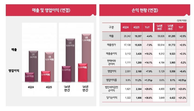 [FETV=신동현 기자] LG CNS는 2025년 매출 6조1295억원, 영업이익 5558억원을 기록했다. 전년 대비 매출은 2.5%, 영업이익은 8.4% 증가했으며, 영업이익률은 9.1%로 0.5%p 개선됐다. 4분기 매출은 1조9357억원, 영업이익은 2160억원으로 집계됐다.