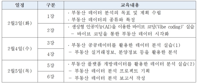 이번 아카데미는 부동산 데이터를 업무에 활용하려는 기업 종사자와 일반인을 대상으로 수강생 30명을 선착순 모집한다. 교육 과정은 부동산 데이터 분석 도구인 파이썬과 생성형 인공지능(AI)을 활용해 부동산 빅데이터 플랫폼 개방 데이터를 분석하는 총 6강의 실습 교육으로 구성된다.