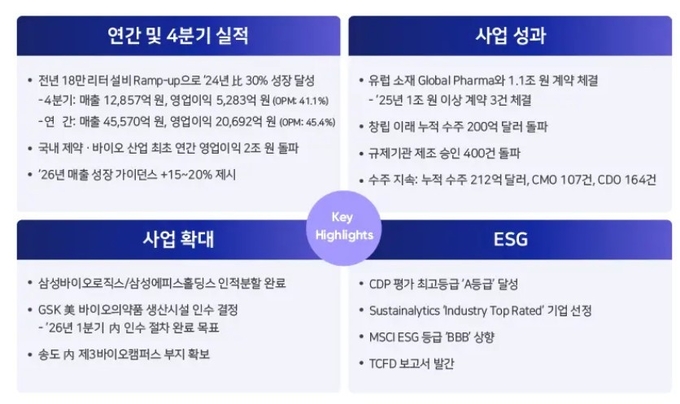삼성바이오로직스는 2025년 연결기준 매출액 4조5570억원(전년 동기 대비 30.3% 증가), 영업이익 2조692억원(56.6% 증가)을 기록했다고 최근 공시했다. 이로써 국내 제약바이오업계 최초로 영업이익 2조원을 달성했다. 4공장 램프업(Ramp-up)과 1~3공장의 안정적 가동, 우호적인 환율 효과로 이러한 실적을 거뒀다고 설명했다.