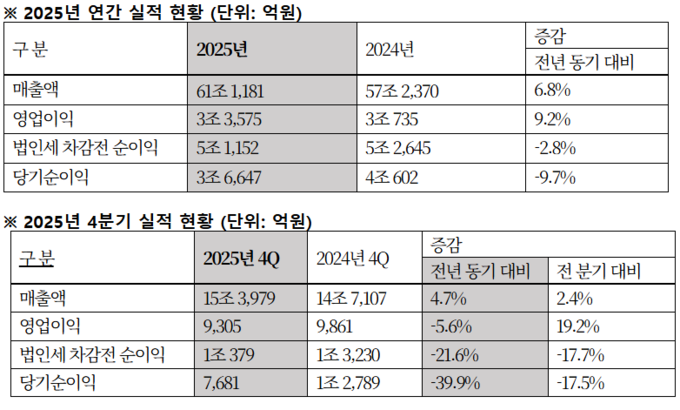 지난해 대비 매출은 6.8%, 영업이익은 9.2% 증가한 수치로 모두 역대 최대 규모다. 4분기 별도 기준으로는 매출 15조3979억원, 영업이익 9305억원을 달성했다. 지난해 같은 기간 대비 매출은 4.7% 상승했으나 영업이익은 -5.6% 감소했다.