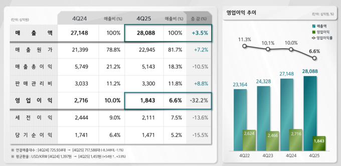 글로벌 판매대수가 2024년 4분기와 비교해 6000여대(0.9%) 감소했지만 가격효과와 우호적인 환율 효과로 인한 평균판매가격(ASP) 상승으로 전년 동기 대비 3.5% 증가한 28조877억원의 매출이 집계됐다. 영업이익의 경우 미국 관세율은 지난해 11월1일부터 15%로 조정됐으나 미국 법인 내 기존 관세 영향을 받은 재고에 따라 실제 판매 기준으로는 약 두 달 간의 25% 관세 부담 효과가 반영됐다. 이외에도 해외 시장 인센티브 증가 등의 영향으로 전년 동기 대비 32.2% 감소한 1조8425억원을 기록했다.