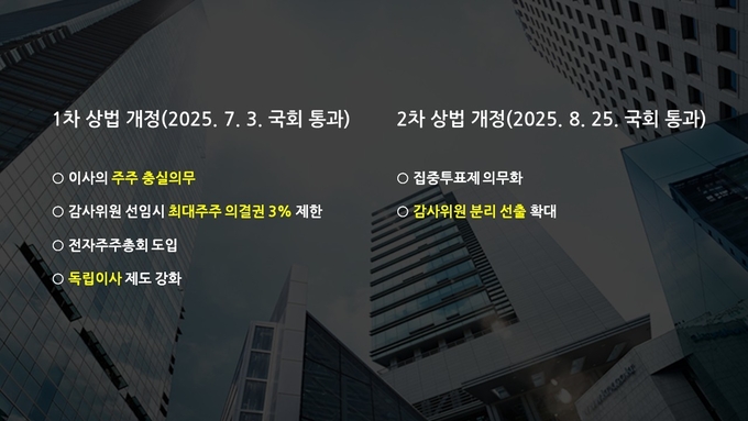 업계에서는 지난해 상법 개정이 코스피 급등을 이끈 요인 중 하나로 작용했다는 평가가 나온다. 1차 상법 개정안은 지난해 7월 3일 국회를 통과했으며 ▲이사의 주주 충실의무 ▲사외이사인 감사위원 선임 시 3% 룰 적용 ▲전자주주총회 도입 ▲독립이사 제도 등 내용을 담았다.