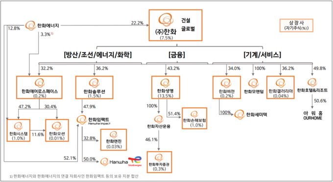 한화그룹의 경우 계열사를 크게 금융 계열사와 비금융 계열사로 나눈다. 비금융 계열사만 놓고 보면 방산과 조선 부문을 담당하는 한화에어로스페이스와 석유화학·신재생에너지를 담당하는 한화솔루션의 두 갈래로 구분된다.
