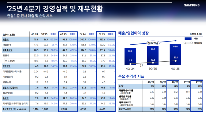 [FETV=이신형 기자] 삼성전자가 연결 기준으로 매출 93조8000억원, 영업이익 20조1000억원의 2025년 4분기 실적을 발표했다.