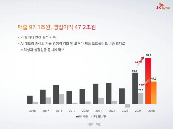 [FETV=신동현 기자] SK하이닉스가 2025년 매출 97조1467억원, 영업이익 47조2063억원을 기록했다고 29일 밝혔다. 영업이익률은 49%에 달했다. 같은 기간 순이익은 42조9479억원으로 순이익률은 44%를 기록했다. 실적은 K-IFRS 기준이다.