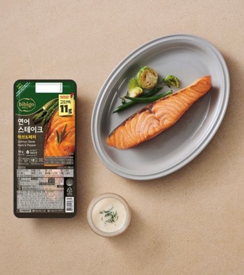 지난달 선보인 ‘비비고 연어 스테이크’는 엑스트라 버진 올리브 오일과 레몬즙으로 연어 고유의 담백한 맛을 살리면서 허브와 흑후추를 더해 비린맛을 낮춘 제품이다. 트레이에 담겨있어 별도의 손질이나 조리 과정 없이 전자레인지에 약 1분 데우기만 하면 간편하게 완성할 수 있다.
