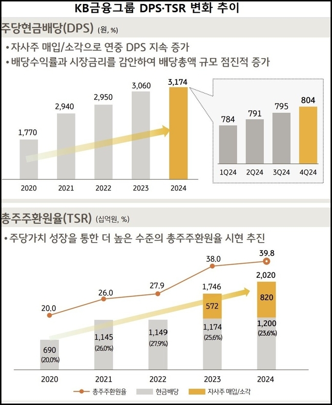 KB금융의 총주주환원율은 지속적으로 상승하고 있다. 2020년 20% 수준이었던 총주주환원율은 2022년 27.9%에 이어 2024년 말에는 39.8%까지 올랐다.