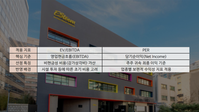 에스팀은 사옥 인테리어 투자비용 등 고정비 성격의 지출이 회계 기준에 따라 매년 감가상각비로 반영되는 만큼 EV/EBITDA를 적용했다고 설명한다. 하지만 업계 일각에서는 엔터업 특성과 맞지 않는 지표를 택한 것 아니냐는 이야기가 나오고 있다.