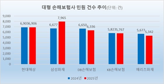 5일 손해보험협회에 따르면 삼성화재, DB손해보험, 메리츠화재, 현대해상, KB손해보험 등 5개 대형 손보사의 2025년 민원 건수는 3만2316건으로 전년 3만1730건에 비해 586건(1.8%) 증가했다.