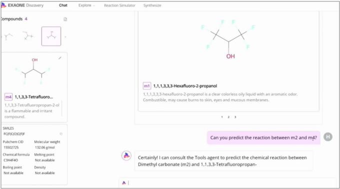 엑사원 디스커버리는 비정형 문서 내의 분자 구조를 직접 선택하거나 ‘m3’나 ‘m5’와 같은 라벨이나 태그를 활용한 대화를 통해 실험 결과를 도출할 수 있는 플랫폼이다.