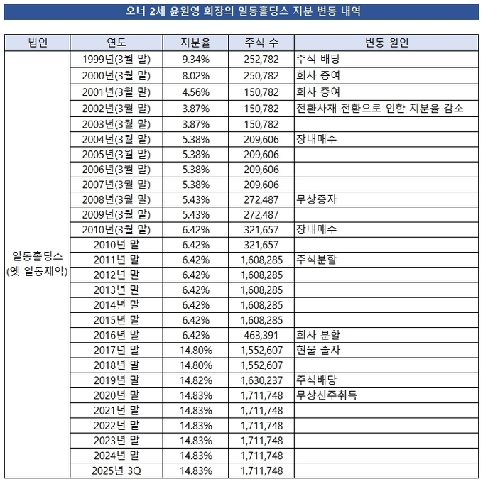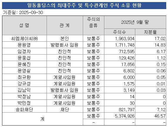 이로부터 지난해 3분기 말까지 오너일가 중 일부가 주식을 매도, 임원 선임·퇴임 등이 이뤄지면서 변동이 있었다. 다만 씨엠제이씨가 일동홀딩스 17.02% 지분을 유지하면서 윤웅섭 회장의 지배력을 공고히 하고 있다. 특수관계인을 포함한 총 지분율은 46.57%다.