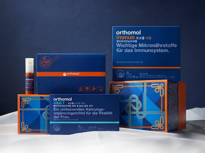 이번 기획팩은 독일에서 온 선물을 표현한 소포 모티브의 그래픽과 패턴 디자인을 적용해, 명절 선물 용 기획팩 컨셉을 시각적으로 구현했다. 베스트셀러 제품인 ‘오쏘몰 이뮨 멀티비타민&미네랄7입’에 1입을 추가 증정하는 구성이다.